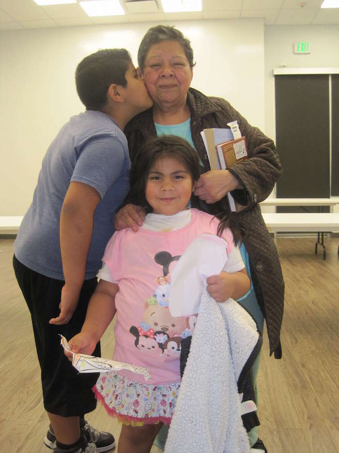 Después que termina la reunión entre todos estos abuelos latinos en Community Coalition, Pablo, de 8 años, y Soledad, de 4 años, se encuentran con su “mamá” en la puerta y la abrazan y la besan. Ella les sonríe cariñosamente.