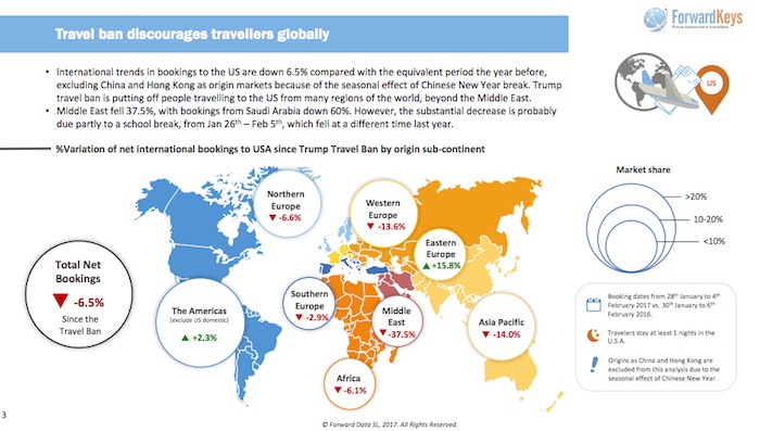 Las políticas proteccionistas y decretos de Donald Trump afectan al turismo extranjero en Estados Unidos. Analistas estiman que bajarán la previsión de visitantes de positivo a negativo, informa The New York Times. Además, un estudio de Forwardkeys muestra un efecto inmediato tras la prohibición del Presidente Trump a la entrada a Estados Unidos a ciudadanos de siete países de mayoría musulmana, entre el 28 de enero y el 4 de febrero, en comparación el mismo periodo de 2016, se desplomaron las visitas en un 80 por ciento de extranjeros procedentes de los países afectados.