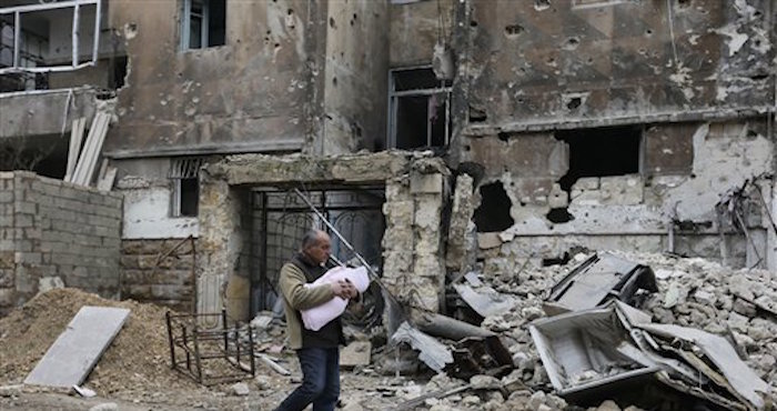 Periodistas de la Associated Press recorrieron la zona en enero y vieron que todavía había un cadáver frente a un hospital que había sido bombardeado. En las paredes había inscripciones dejadas por los rebeldes.