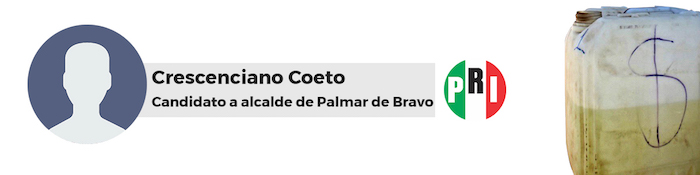 Versiones publicadas por el diario Cambio señalan que el candidato a alcalde por el PRI en Palmar de Bravo, Crescenciano Coeto tiene entre su familia a Manuel López Coeto, quien murió en un enfrentamiento en 2017 y estuvo relacionado con la delincuencia organizada y el robo de hidrocarburo.