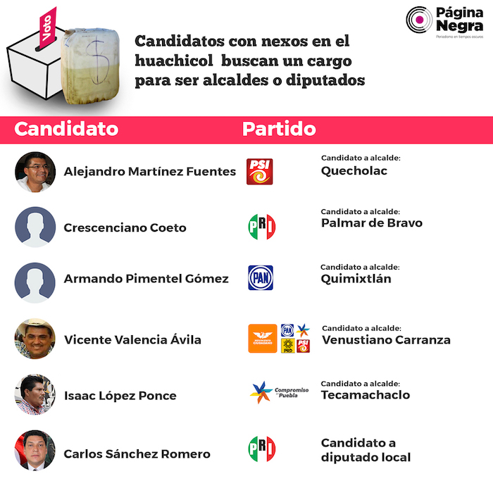 Justo todos los aspirantes a alcaldes son postulados en municipios que están en la llamada Franja del Huachicol: Alejandro Martínez Fuentes, candidato a la presidencia municipal de Quecholac por Pacto Social de Integración (PSI); Crescenciano Coeto, por Palmar de Bravo por el Partido Revolucionario Institucional (PRI).