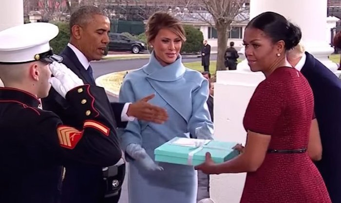 El gesto de Michelle Obama al recibir un regalo de Melania Trump. Foto: Especial.