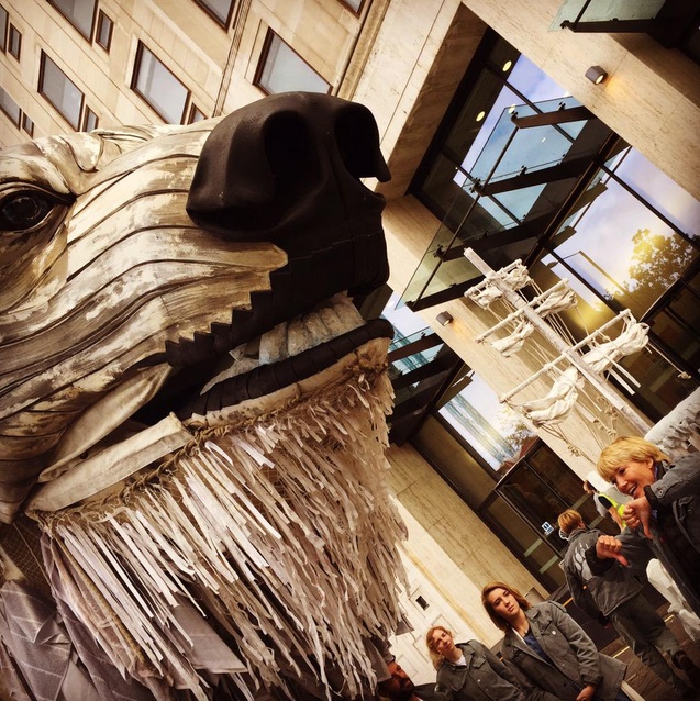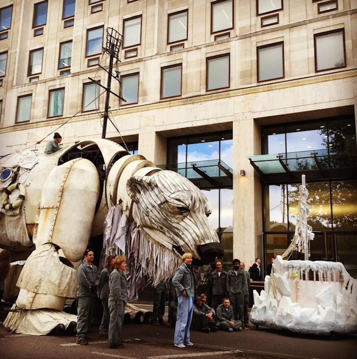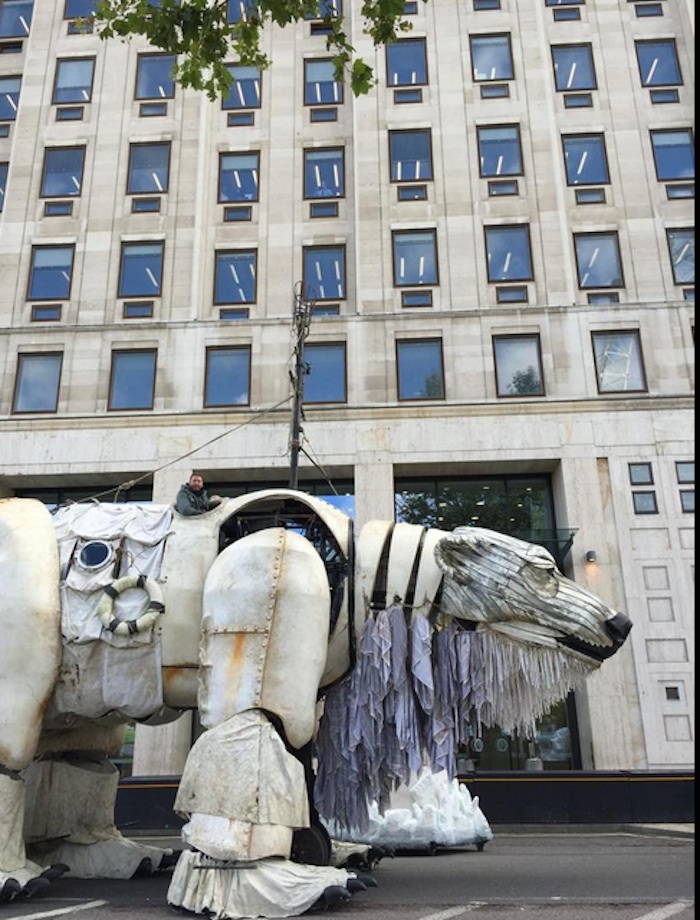 - Greenpeace instaló un oso polar robótico gigante en la sede de Shell en Londres a manera de protesta. Foto: Twitter @rorogers123