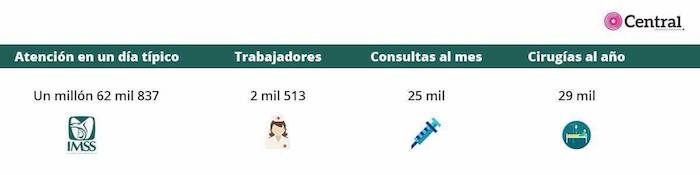 De acuerdo con información proporcionada por el IMSS a Central, el hospital San Alejandro atiende en un día típico a un millón 62 mil 837 derechohabientes, al mes se registran 25 mil consultas en promedio y se contabilizan 25 mil cirugías por año.