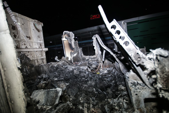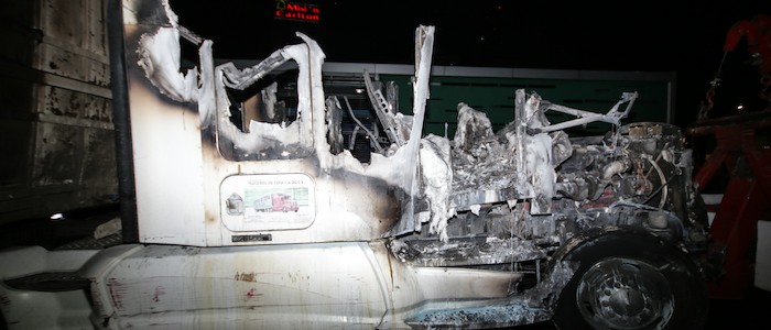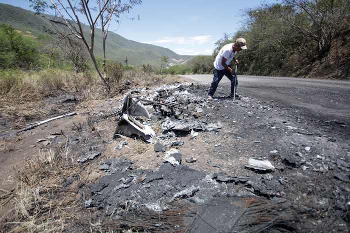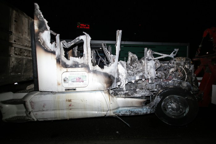 En al menos cuatro puntos, manchas negras de incendio y cristales rotos sobre el pavimento anticiparon la presencia de los cascarones de igual número de tracto-camiones que, al mediodía de ayer, ya estaban a un lado de la carretera y en manos de empleados de compañías de grúas contratadas por la Policía Federal para desbloquear los accesos.