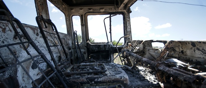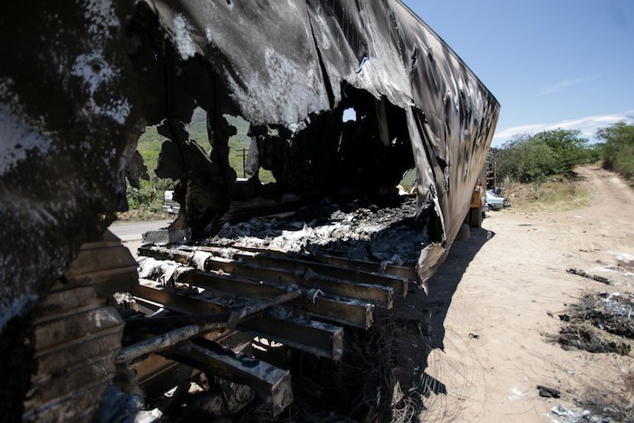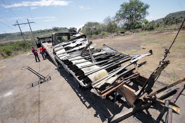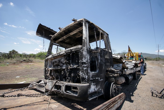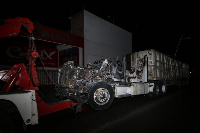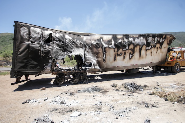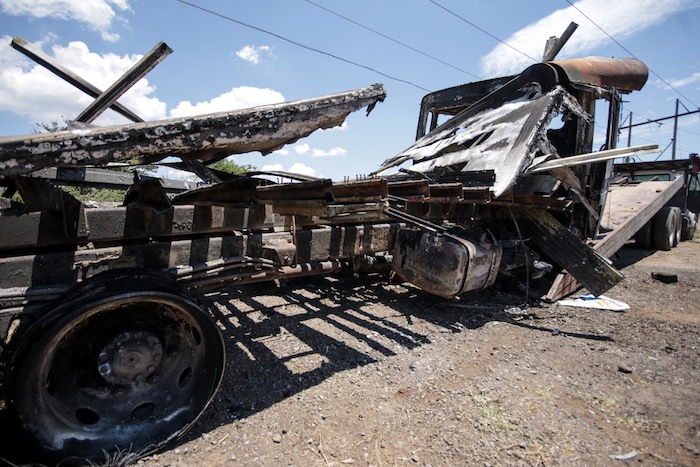 - Tráiler quemado en los incidentes provocados por miembros del CJNG el 1 mayo en Jalisco. Foto: Francisco Cañedo, SinEmbargo