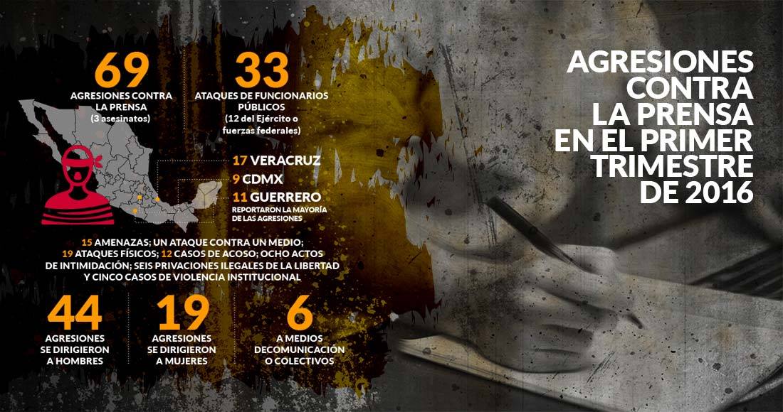 Durante los tres primeros meses de este año, Artículo 19 ha registrado 69 agresiones contra la prensa mexicana, de las cuales 33 fueron por parte de funcionarios públicos y se han concentrado en Veracruz, Guerrero y la Ciudad de México. En este periodo tres periodistas fueron asesinados. Las condiciones para que los periodistas y comunicadores ejerzan su labor no han mejorado, al contrario, cada vez son más precarias, concluye el informe trimestral "Sin prensa no hay democracia". El primer asesinato de un periodista este año ocurrió apenas durante los primeros 21 días de 2016.