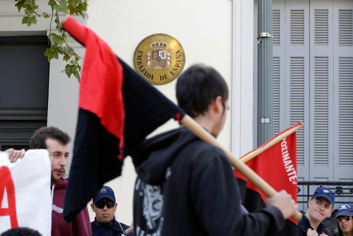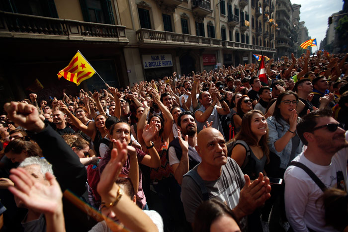 Esta sede fue el foco central de los protestantes, que sumaron miles a mediodía y gritaron consignas calificando a la policía española de "fuerza de ocupación". También pidieron la renuncia del presidente del gobierno Mariano Rajoy.
