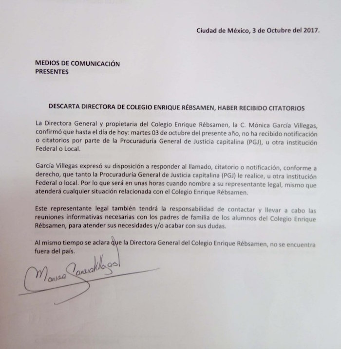Ciudad de México, 3 de octubre (SinEmbargo).- La dueña y directora del Colegio Enrique Rébsamen, Monica García Villegas, descartó este día haber recibido citatorios de la Procuraduría General de Justicia (PGJ) capitalina, así como que se encuentre fuera del país.