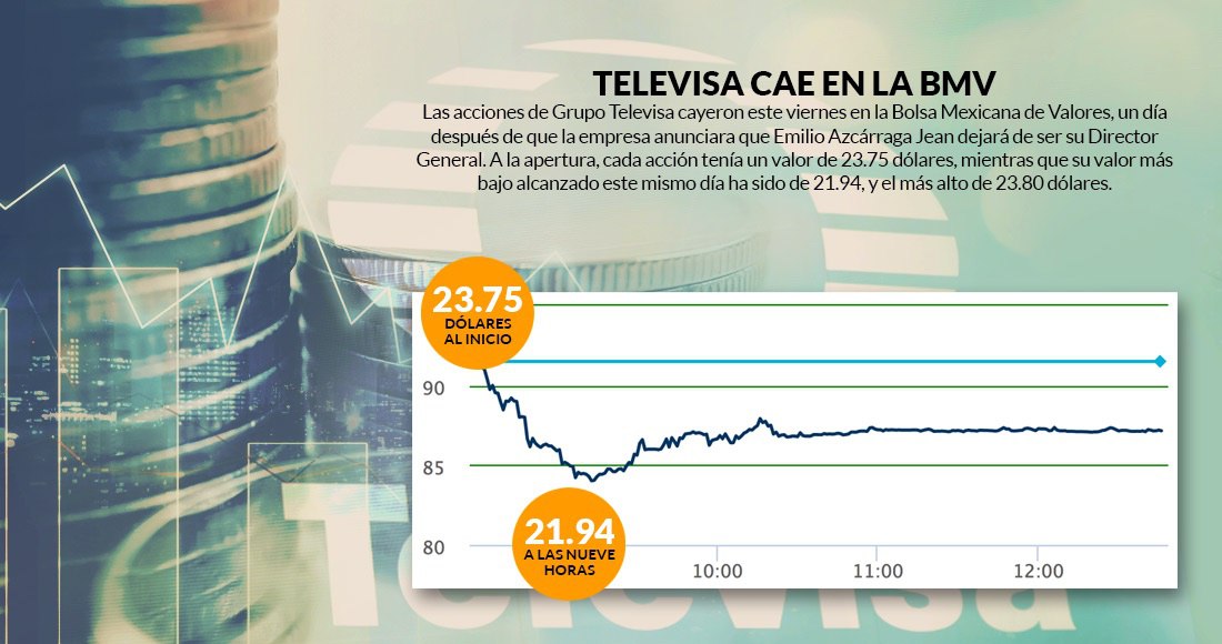Un día después del anuncio de la salida de Emilio Azcárraga Jean como director de Grupo Televisa, las acciones de la empresa cayeran 4.88 por ciento la mañana de este viernes, al colocarse en los 22.71 dólares por acción.