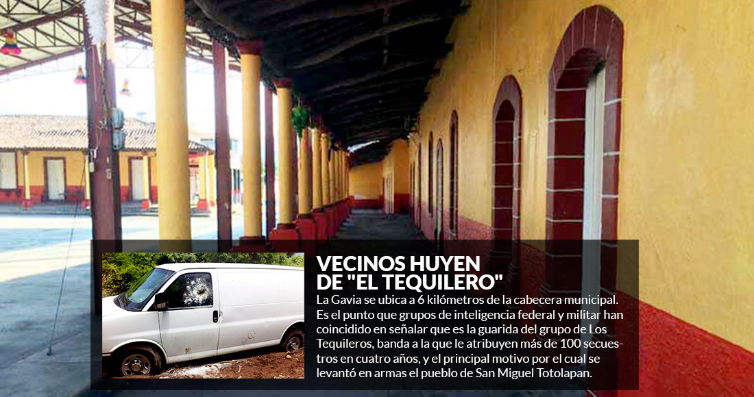 Este lunes ingresaron reporteros de diferentes medios de comunicación a la comunidad La Gavia. Es un recorrido de 6 kilómetros desde la cabecera municipal de San Miguel Totolapan al pueblo. La carretera está en buen estado. Antes de La Gavia está San Antonio, ahí en un techado cerca de la capilla hay grupos de la autodefensa vigilando el paso. En el pueblo no está el líder criminal Raybel Jacobo de Almonte, "El Tequilero"; tampoco están los más de 400 vecinos que desde la primer semana de mayo comenzaron a irse ante los distintos hechos de violencia.