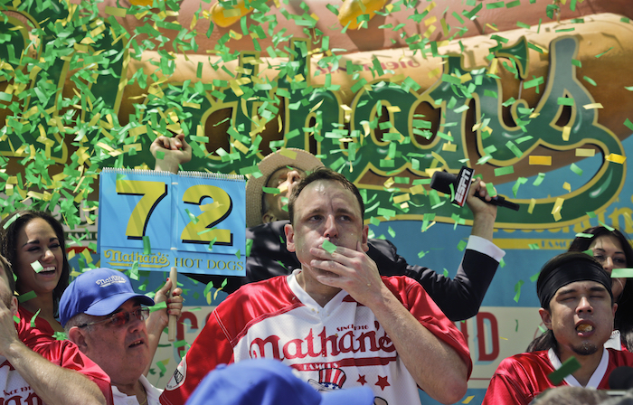 Joey "Jaws" Chestnut se preparaba el martes para defender su título como el mayor tragón de perros calientes. Se enfrentará en una revancha contra Matt "The Megatoad" Stonie en Coney Island.