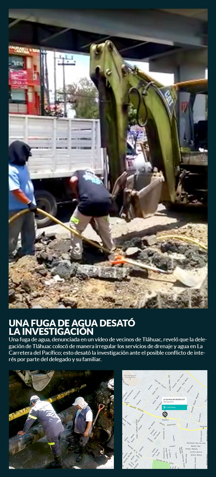 La investigación se volcó hacia los negocios de la hermana del Delegado, cuando en julio de 2016 los vecinos de Tláhuac denunciaron a través de un video que en la calle Salvador Díaz Mirón en la colonia Santa Ana Poniente, una calle que hace esquina con la Avenida Tláhuac, en donde se ubica el restaurante “La Carreta del Pacífico”, propiedad de Araceli, había obras realizadas por los trabajadores de la Delegación que afectaron a la red de suministro de agua.