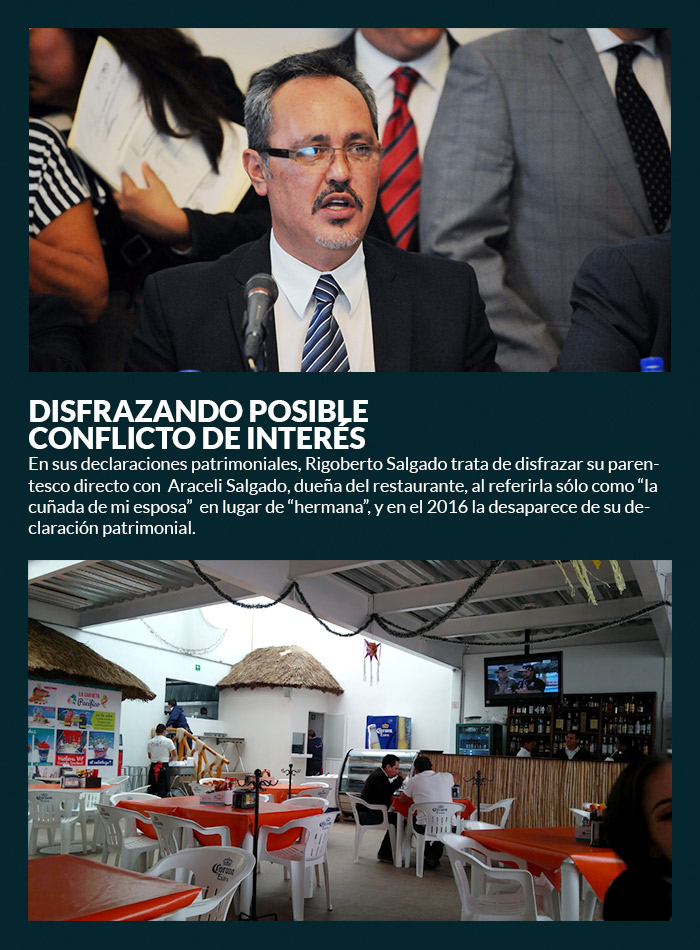 Pero Rigoberto Salgado, quien es investigado por al menos tres autoridades de distintos niveles, omitió mencionar en su declaración patrimonial el posible conflicto de interés.De acuerdo con la investigación, en su declaración patrimonial de 2015, el Delegado no declara conflicto de interés. Más aún, señala a su hermana Araceli indirectamente, como “la cuñada de mi esposa”. En su declaración de un año después, en 2016, el nombre de la mujer desaparece de su declaración.