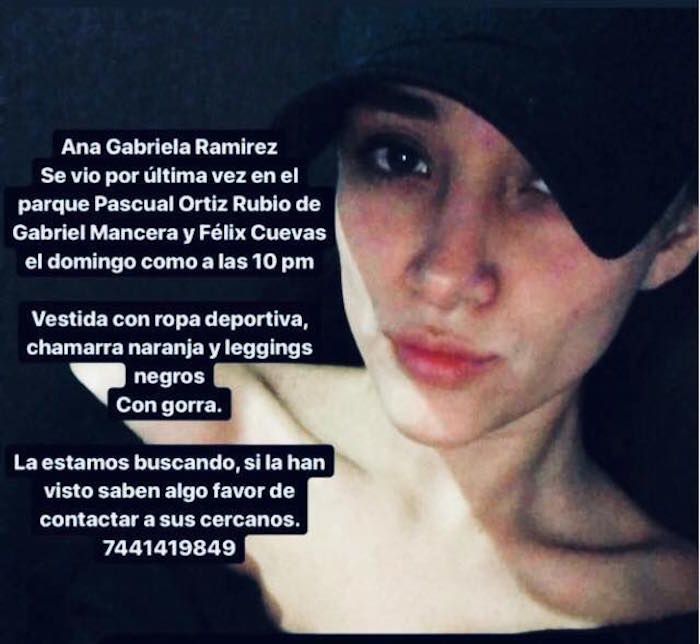 “La estamos buscando. Si la han visto o saben algo, favor de contactar a sus cercanos”, se lee en uno de los mensajes que fueron acompañados de la fotografía de Gabriela.