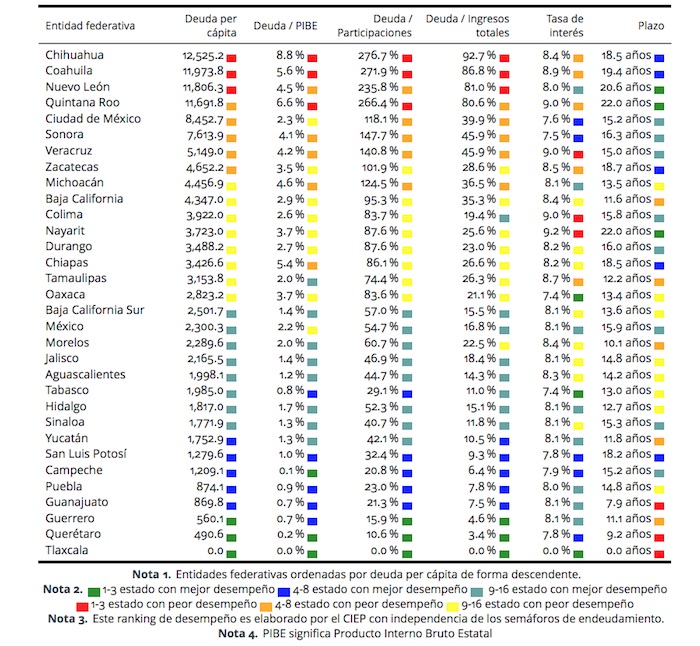 Chihuahua, Coahuila, Nuevo León y Quintana Roo son los estados que tenían un endeudamiento per cápita superior a 11 mil 690 pesos. Respecto a la tasa de interés, Nayarit, Colima, Veracruz, Quintana Roo, Coahuila y Tamaulipas pagaban una superior al 8.6 por ciento por sus créditos hasta septiembre de 2017.