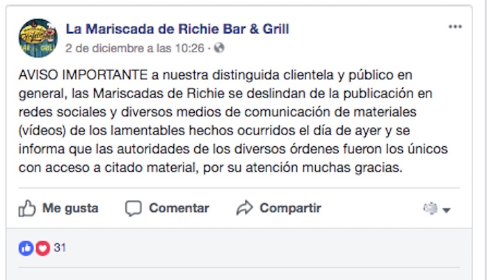 Después del crimen empezó a circular en redes sociales el vídeo del momento en que el mando policiaco fue victimado. El restaurante donde ocurrió el asesinato se deslindó de filtrar las imagenes.