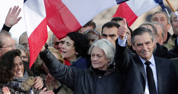 La esposa de Fillon, Penélope, apareció al lado del candidato en la manifestación. Ella ha mantenido un muy bajo perfil desde que investigadores financieros comenzaron a indagar alegatos de que ella y dos de sus hijos ocuparon puestos pagados con fondos públicos pero nunca trabajaron. Su trabajo, especialmente, duró muchos años.