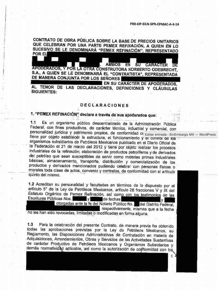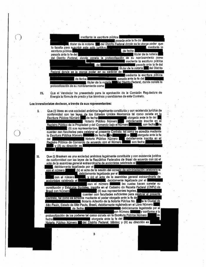 En los convenios entre Pemex y Oderbrecht, lo que sobresale son tachaduras en negro que abarcan líneas, párrafos y hasta páginas enteras. No es posible conocer quiénes firmaron como representantes legales ni por parte de Pemex ni de Oderbrecht. Los montos de los servicios que daría la constructora brasileña también están en negro y se vuelven invisibles. Las obligaciones de entregas también están censurados. Así, los nombres de notarios, sellos y firmas.