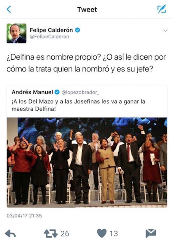 El pasado martes en la madrugada, el ex mandatario panista escribió en su cuenta de Twitter @FelipeCalderon: “¿Delfina es nombre propio? ¿O así le dicen por cómo la trata quien la nombró y es su jefe?”