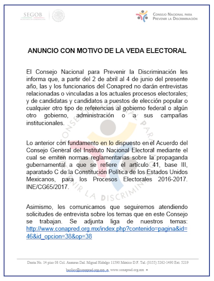 SinEmbargo buscó desde el martes por la tarde una entrevista con algún funcionario de Conapred, para abundar en los datos recientes obtenidos a través de su campaña en México y para conocer su posición en torno al tuit de Felipe Calderón.