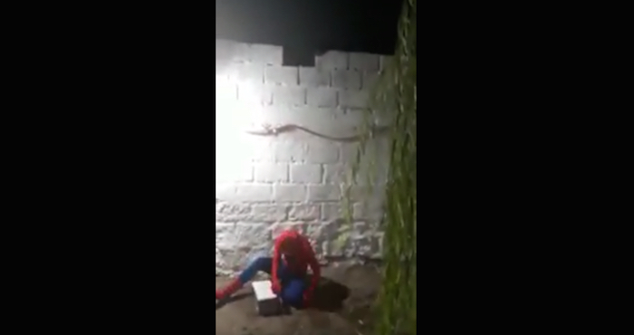 El tabique impactó contra una de las piernas de Spiderman, seguramente provocando alguna molestia, aunque en el video no se puede distinguir si hubo consecuencias mayores.