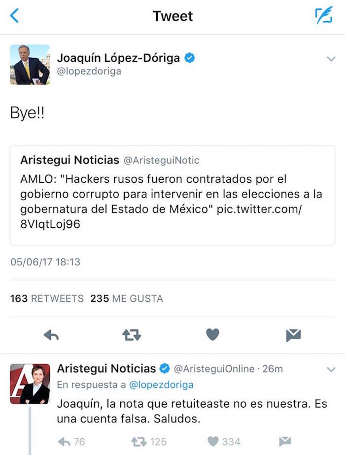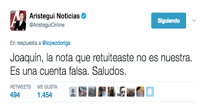 “Joaquín, la nota que retuiteaste no es nuestra. Es una cuenta falsa. Saludos'', escribió la cuenta oficial de Aristegui en Twitter.