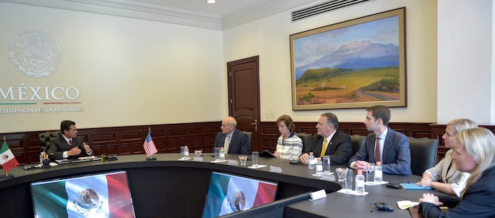 Durante el encuentro de trabajo, el Secretario Kelly estuvo acompañado por la Embajadora de Estados Unidos en México, Roberta S. Jacobson, por el Director General de la Agencia Central de Investigaciones (CIA, por sus siglas en inglés), Michael Richard Pompeo, y por el Senador por el Estado de Arkansas, Tom Cotton.