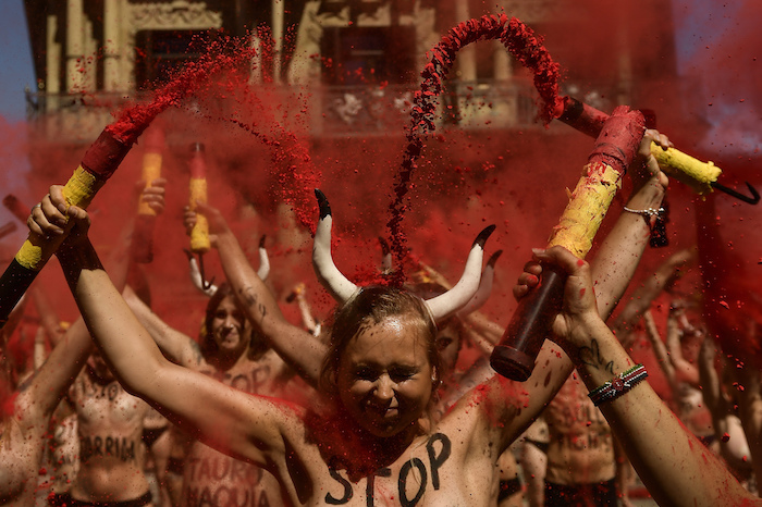 Algunos activistas portaban cuernos de plástico y tenían el cuerpo lleno de polvo rojo para simular sangre. Otros escribieron “Paren las corridas de toros” en sus torsos en distintas lenguas como respuesta a la campaña “San Fermín sin sangre” liderada por la organización Personas por el Trato Ético de los Animales (PETA por sus siglas en inglés) y por la organización por la defensa de animales AnimalNaturalis.