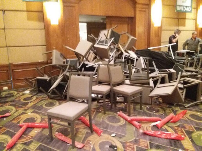 La confrontación aconteció en el Salón Nuevo León del Hotel Crowne Plaza, en el centro de Monterrey, y quedó registrada en video. Las imágenes, que ya circulan por redes sociales, muestran a varias personas lanzando sillas, mientras otros huyen del sitio para evitar que los lastimen.