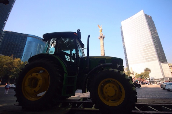 Ciudad de México, 5 de diciembre (SinEmbargo).– Una caravana de 43 tractores de El Barzón se concentró esta mañana en el Ángel de la Independencia para marchar en solidaridad con las familias de los normalistas desaparecidos de Ayotzinapa y para exigir mejores condiciones para el campo y salvar a los productores de las tiendas departamentales como Wal-Mart, Aurrerá y Soriana que pagan a bajo costo el frijol y maíz a los campesinos.