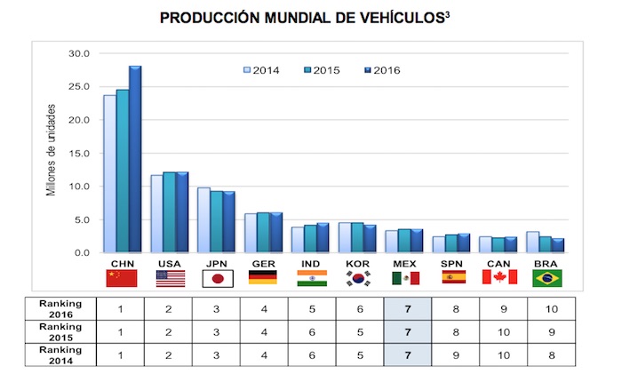En 2016, y por tercer año consecutivo, México se posicionó como el séptimo productor de vehículos en el mundo y el 1º en América Latina, superando a países como España, Brasil y Canadá, y contribuyó con el 3.8 por ciento de la producción mundial.
