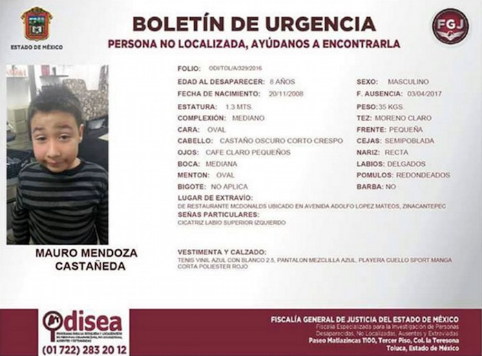 Ciudad de México, 6 de abril (SinEmbargo).- El niño de 8 años, Mauro Mendoza Castañeda, fue sustraído de un restaurante McDonald's, en la avenida Adolfo López Mateos, en Zinacantepec, Estado de México, denuncio en su cuenta de Facebook su madre.