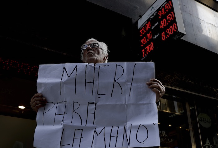 Un hombre con un letrero se encuentra frente a una casa de cambio en Buenos Aires. Foto: AP.