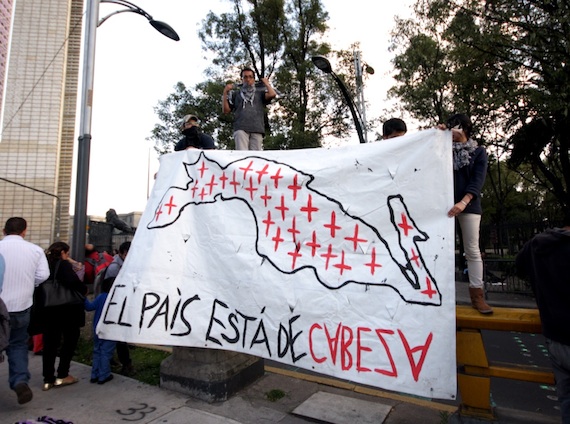 Si en las primeras dos movilizaciones –del 15 y 22 de octubre pasados– al imprescriptible “¡Vivos se los llevaron, vivos los queremos!” le acompañó la exigencia de renuncia de Ángel Aguirre Rivero (ahora Gobernador de Guerrero con licencia) y de Enrique Peña Nieto, en la marcha de ayer a la consigna de “Fuera Peña Nieto” le alcanzó el “que se vayan todos” y hasta el señalamiento de “Narco Estado”.