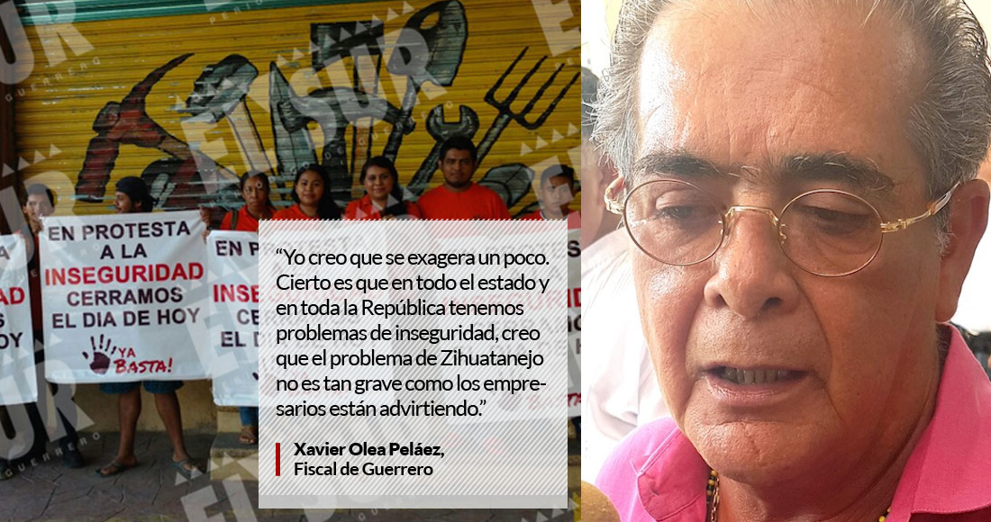 Hace un mes, el pasado 5 de noviembre, dueños de diversos negocios en Zihuatanejo bajaron sus cortinas para protestar en contra los asaltos, secuestros y extorsiones. Sin embargo, se enfrentaron a la respuesta desinteresada del Fiscal del estado, Xavier Olea Peláez, quien dijo en este puerto que las manifestaciones de los empresarios denunciando la inseguridad son exageradas.