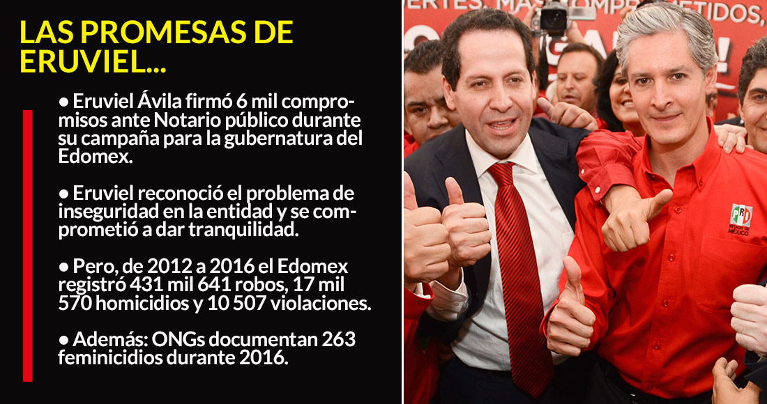 El candidato priista Alfredo del Mazo Maza, ex Alcalde de Huixquilucan, Estado de México, ha planteado como prioridad la inseguridad de la entidad. Durante la gestión del otro priista, Eruviel Ávila Villegas –quien firmó ante Notario Público 6 mil compromisos– se registraron 431 mil 641 robos, 17 mil 570 homicidios y 10 mil 507 violaciones en la entidad, de acuerdo con cifras oficiales. Ambos prometieron cámaras de vigilancia en el transporte público. Eruviel no lo cumplió.