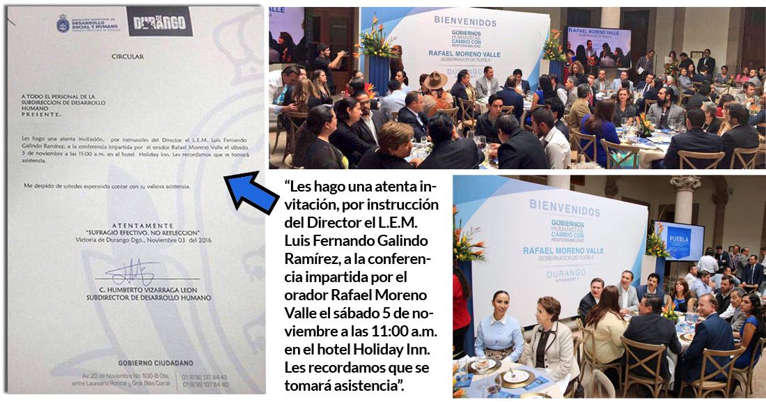 Sin embargo en Durango, los burócratas fueron obligados a asistir al evento del mandatario poblano, pues en Facebook se difundió la solicitud que se les envió a los trabajadores para asistir a la conferencia de Moreno Valle.