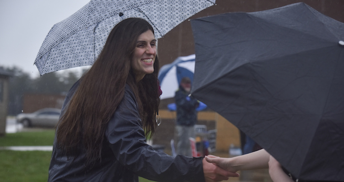 Danica Roem, quien contendía por un puesto en la Cámara de Delegados en Virginia, estrecha la mano de los votantes en Gainesville, Virginia, el martes 7 de noviembre de 2017. Foto: AP