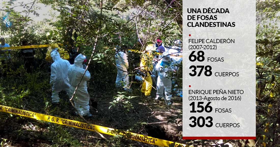 En agosto de este año, la periodista Sandra Rodríguez Nieto dio cuenta en SinEmbargo, de acuerdo con datos de la Procuraduría General de la República (PGR), que durante el sexenio de Calderon Hinojosa se encontraron 68 fosas con los restos de 378 personas y, con Peña Nieto el número de fosas clandestinas llegó a las 156 con los restos de 303 personas.