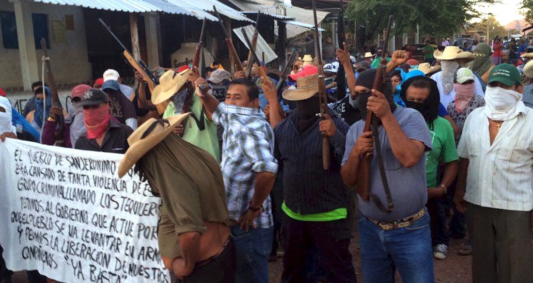 La violencia no concluyó en Guerrero con el caso de los normalistas. Este año los pobladores continúan levantándose en armas. En noviembre unos 200 habitantes de la comunidad San Jerónimo el Grande, municipio de Ajuchitlán del Progreso, tomaron las armas para defenderse del grupo criminal Los Tequileros.