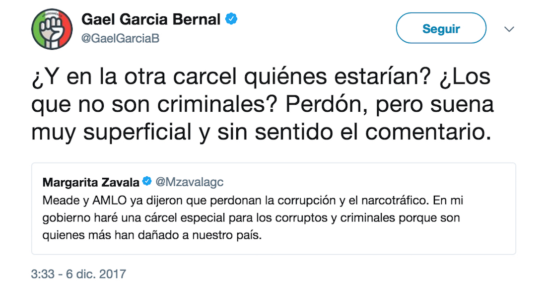 Tras la publicación del tuit, Gael García respondió. El actor cuestionó la medida a tomar de Zavala: “¿Y en la otra cárcel quiénes estarían? ¿Los que no son criminales? Perdón, pero suena muy superficial y sin sentido el comentario”.