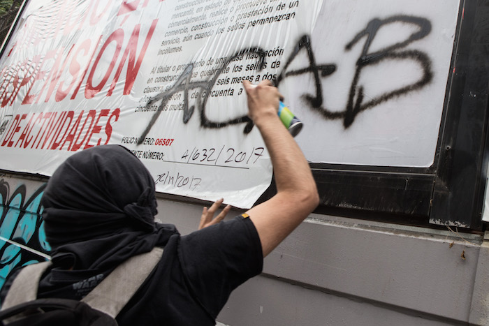 Durante el recorrido, grupos de supuestos anarquistas realizaron pintas en negocios y calles por las que la manifestación pasó. Además, por varios minutos cerraron Avenida de los Insurgentes.