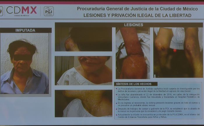 Una niña de 7 años fue sometida a tortura y tratos inhumanos de parte de su abuela, quien la tenía encadenada a una ventana en un pequeño cuarto; le propinaba golpes, heridas con objetos punzocortantes y la privaba de recibir alimentos. De acuerdo con testigos, en los últimos días de 2016, la pequeña fue abandonada en calles de la delegación Iztapalapa, donde fue hallada por elementos de la policía capitalina.