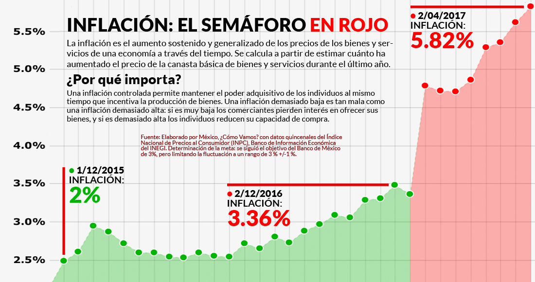 En enero los precios al consumidor subieron 1.70 por ciento para llegar a una tasa de inflación anual de 4.72 por ciento. El aumento de los precios en el primero mes del año fue el más alto registrado en casi dos décadas, al ser el más alto en 18 años debido al aumento de las tarifas elécticas y las gasolinas. La inercia en el alza a los energéticos impactó a la inflación en los meses posteriores: en febrero la inflación general creció 4.86 por ciento y en marzo, los precios al consumidor presentaron un alza de 0.61 por ciento mensual, así como la tasa de inflación anual se colocó en 5.35 por ciento, el doble de lo que se posicionó durante el mismo periodo de 2016 cuando se ubicó en 2.60 por ciento anual.
