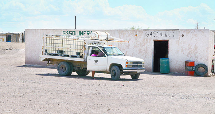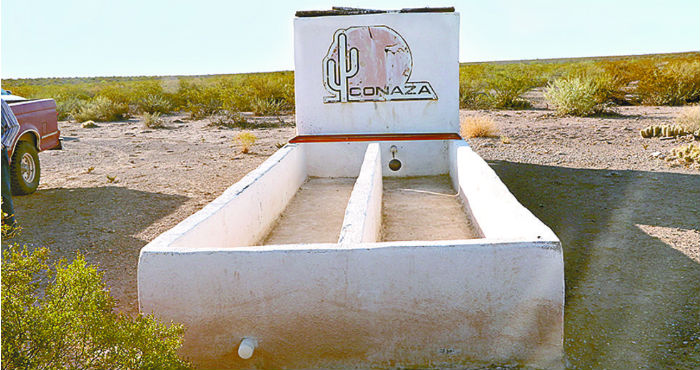 La imagen de las camionetas con sus tinacos, listas para cargar agua del pozo del ejido y llevarla hasta a los bebederos pecuarios en las profundidades del desierto, se repite desde la entrada a estos poblados.
