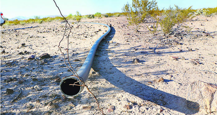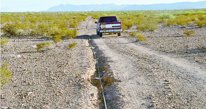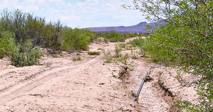 En este ejido, como en otros de la región de Ocampo, la Conaza mandó tender líneas de conducción que van desde el pozo comunitario, que por cierto está sobreexplotado, ocho, 12 o 14 kilómetros de pendiente por el desierto tortuoso, hasta las pastas donde se construyeron las pilas y los bebederos pecuarios. Foto: Luis Salcedo, Vanguardia