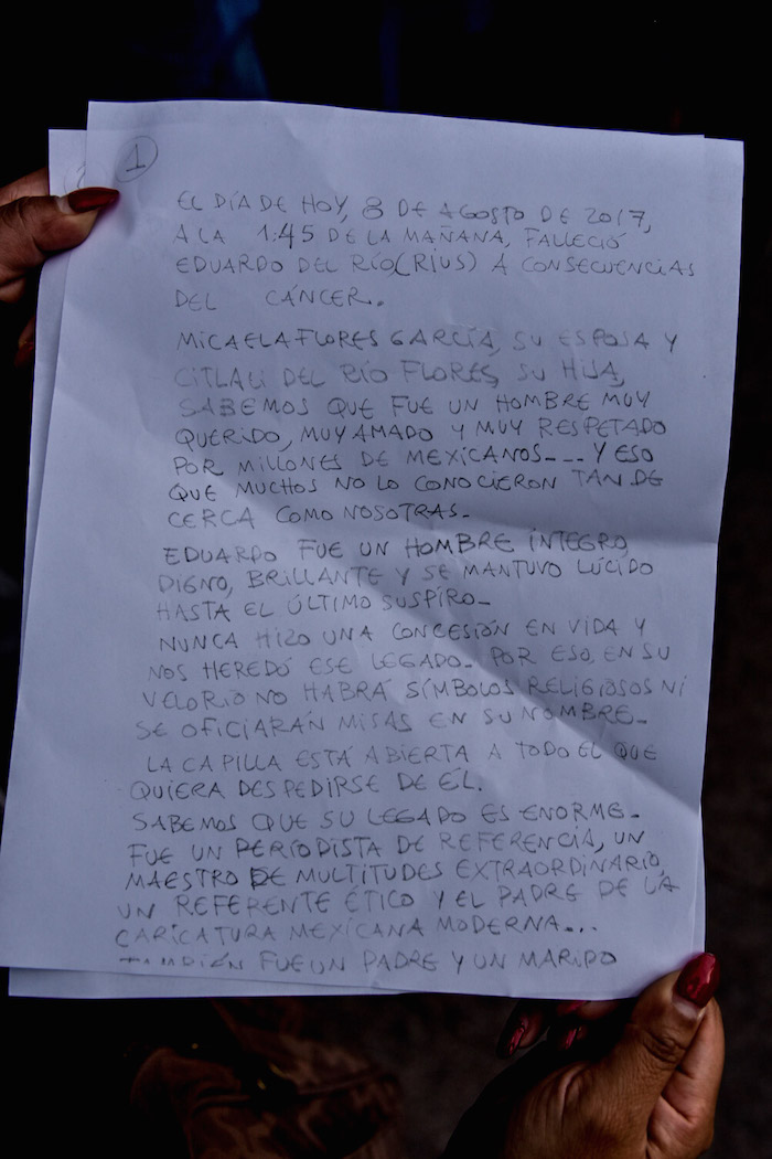 Su hija Citlalli compartió una carta ante los medios de comunicación. “Nunca hizo una concesión en vida y nos heredó ese legado. Por eso, en su velorio, no habrá símbolos religiosos ni se oficiarán misas en su nombre'', escribió.