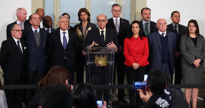 El canciller peruano, Ricardo Luna (c), preside la declaración conjunta con los otros cancilleres y ministros de relaciones exteriores de 17 países de América y el Caribe. Foto: EFE
