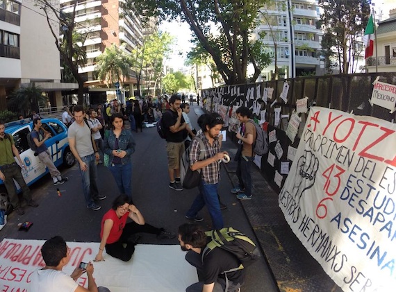 La Embajada de México en Argentina luce cubierta con fotografías de los normalistas desaparecidos. Además de mantas donde expresan su solidaridad con los estudiantes mexicanos. "Ayotzinapa otro crimen del estado mexicano", se lee en una de ellas.